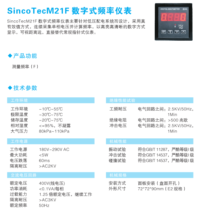 SincoTecM21F数字式频率仪表主要针对低压配电系统而设计,采用真有效值方式,连续采集单相电压并计算频率,以高亮高清晰的数字方式显示,可视距离远,直接替代常规指针式仪表。